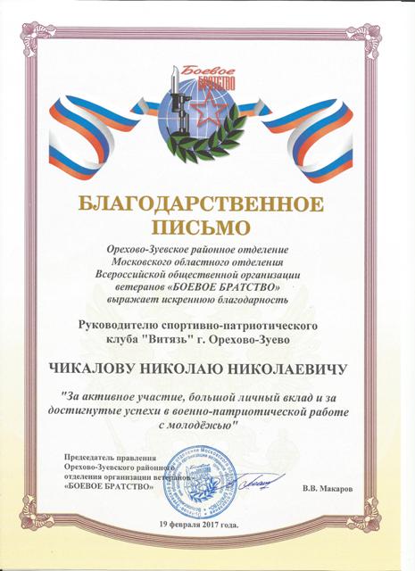 19 февраля, в Центральной городской библиотеке им. М.Горького состоялась торжественная линейка спортивно-патриотического клуба "Витязь", посвященная Дню защитника Отечества. На мероприятии присутствовали воспитанники клуба "Витязь", родители. Почётными гостями на празднике были председатель правления Орехово-Зуевского районного отделения организации ветеранов " БОЕВОЕ БРАТСТВО", капитан в отставке В.В. Макаров, член "Морозовского клуба", заслуженный испытатель космической техники РФ, подполковник в отставке А.Н. Рябов, председатель правления АНО РЦ "Витязи Подмосковья" , подполковник в отставке С.А. Михайлов, заместитель начальника штаба АНО РЦ "Витязи Подмосковья", майор в отставке ФСБ С.С.Сидоров, а так же руководители военно-патриотических клубов из Орехово-Зуевского и Шатурского районов.