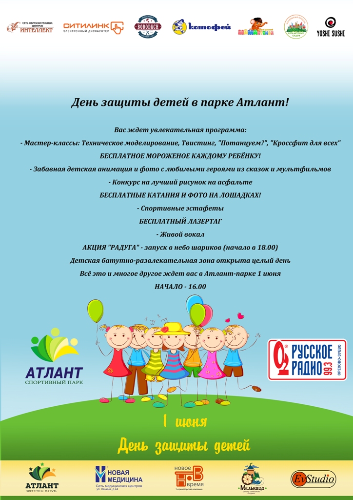 1 июня в честь ДНЯ ЗАЩИТЫ ДЕТЕЙ спортивный парк "Атлант" совместно с Русским радио приглашает всех к нам на ПРАЗДНИЧНУЮ ПРОГРАММУ! Начало в 16:00!!!